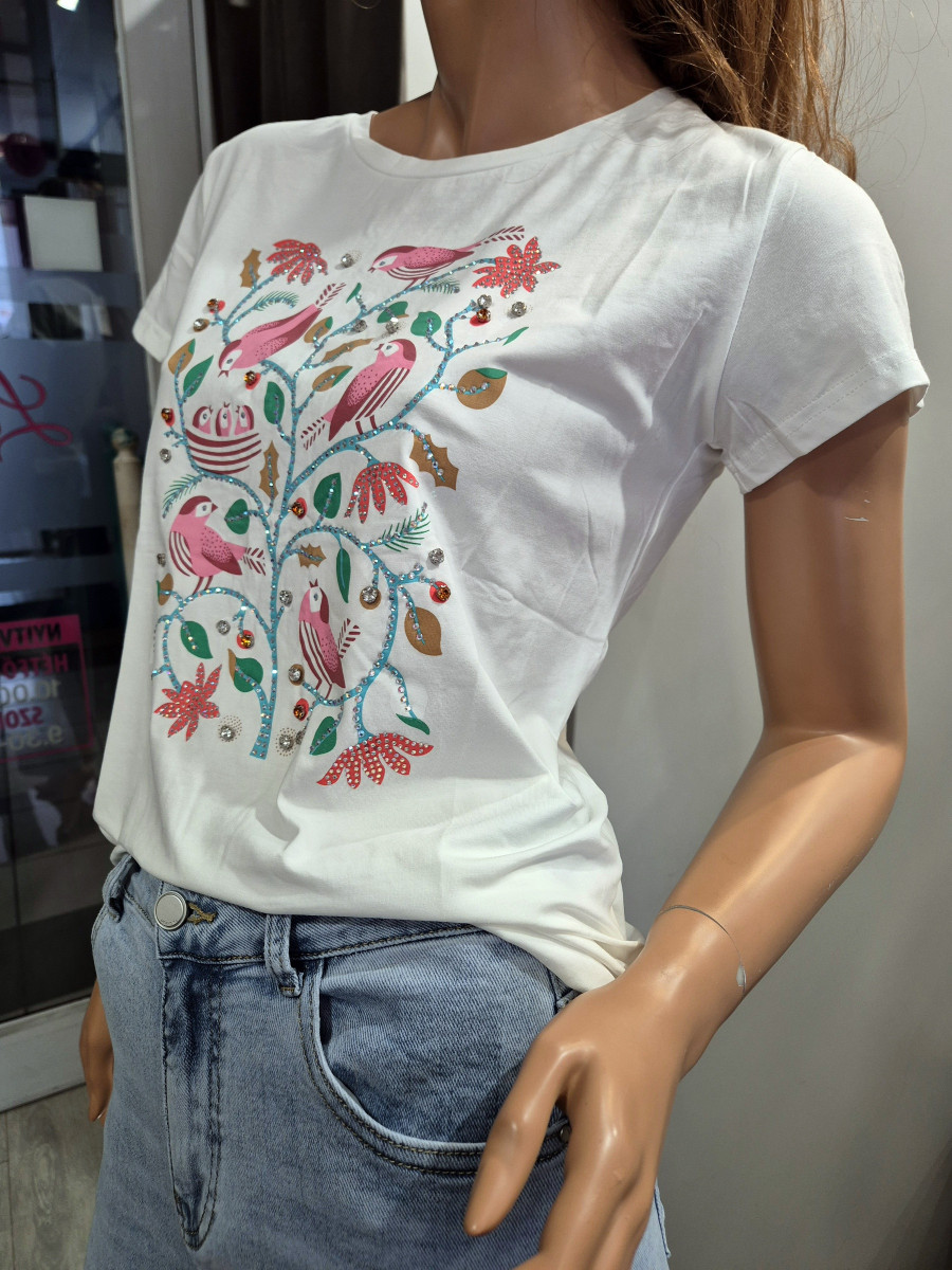 Prémium pamutos anyagú póló , elején nyomott mintával kövekkel flitterekkel.