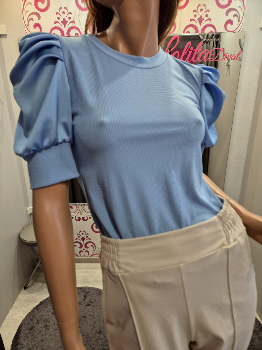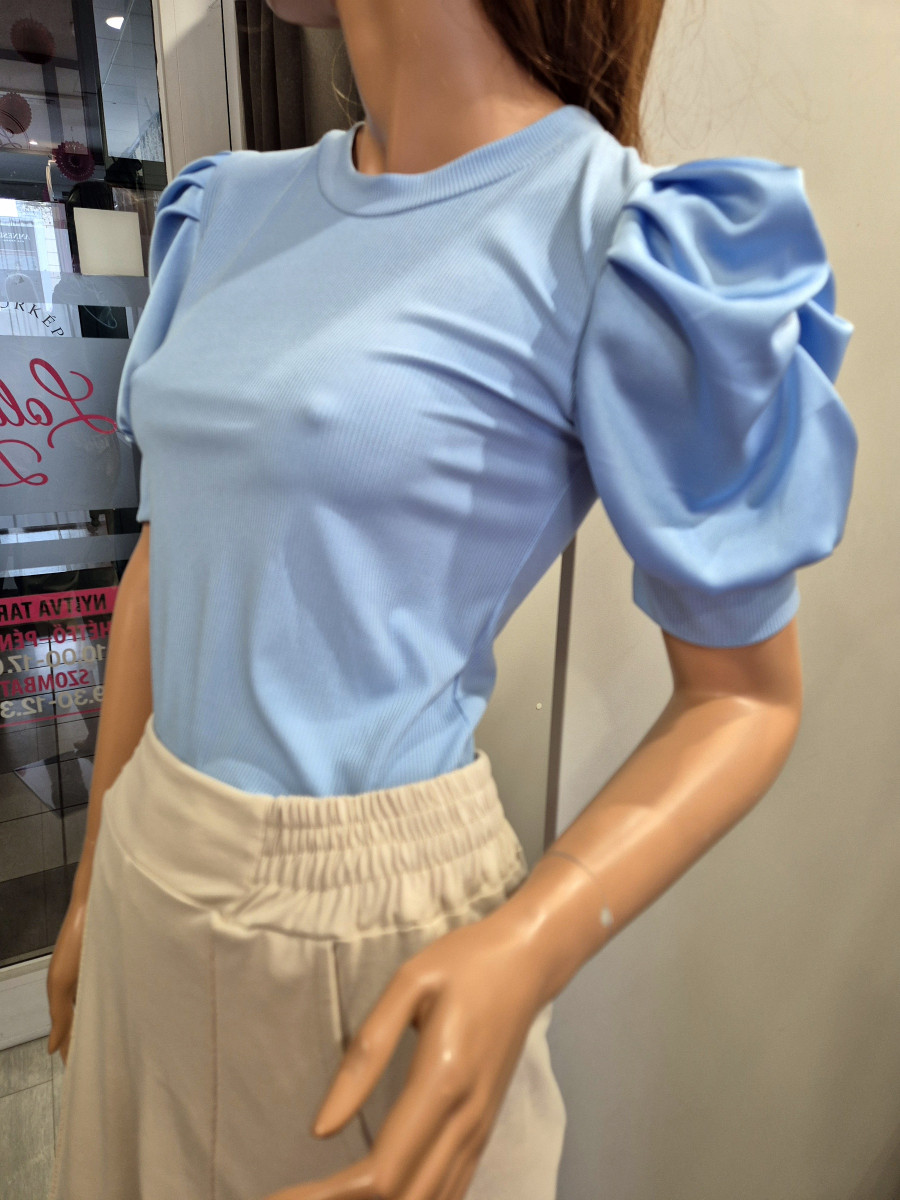 Nagyon kényelmes kedvelt fazonú bordázott rugalmas anyagú szatén puffos ujjú felső.