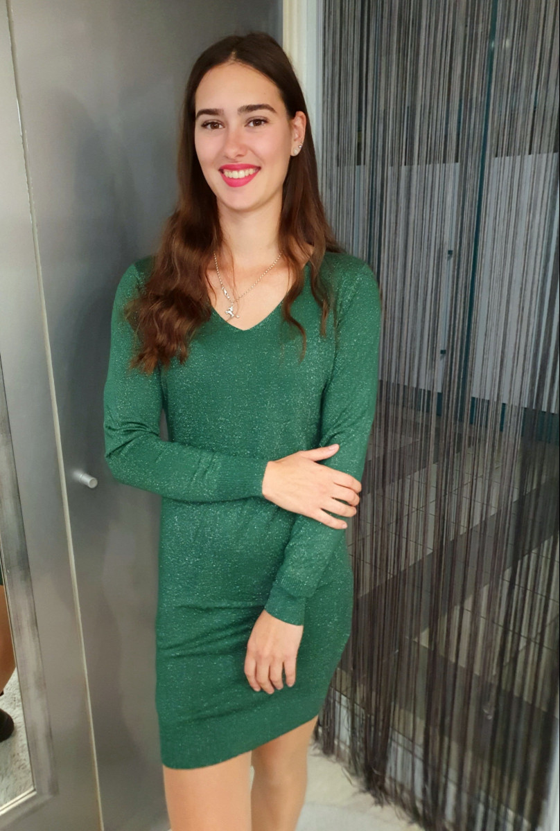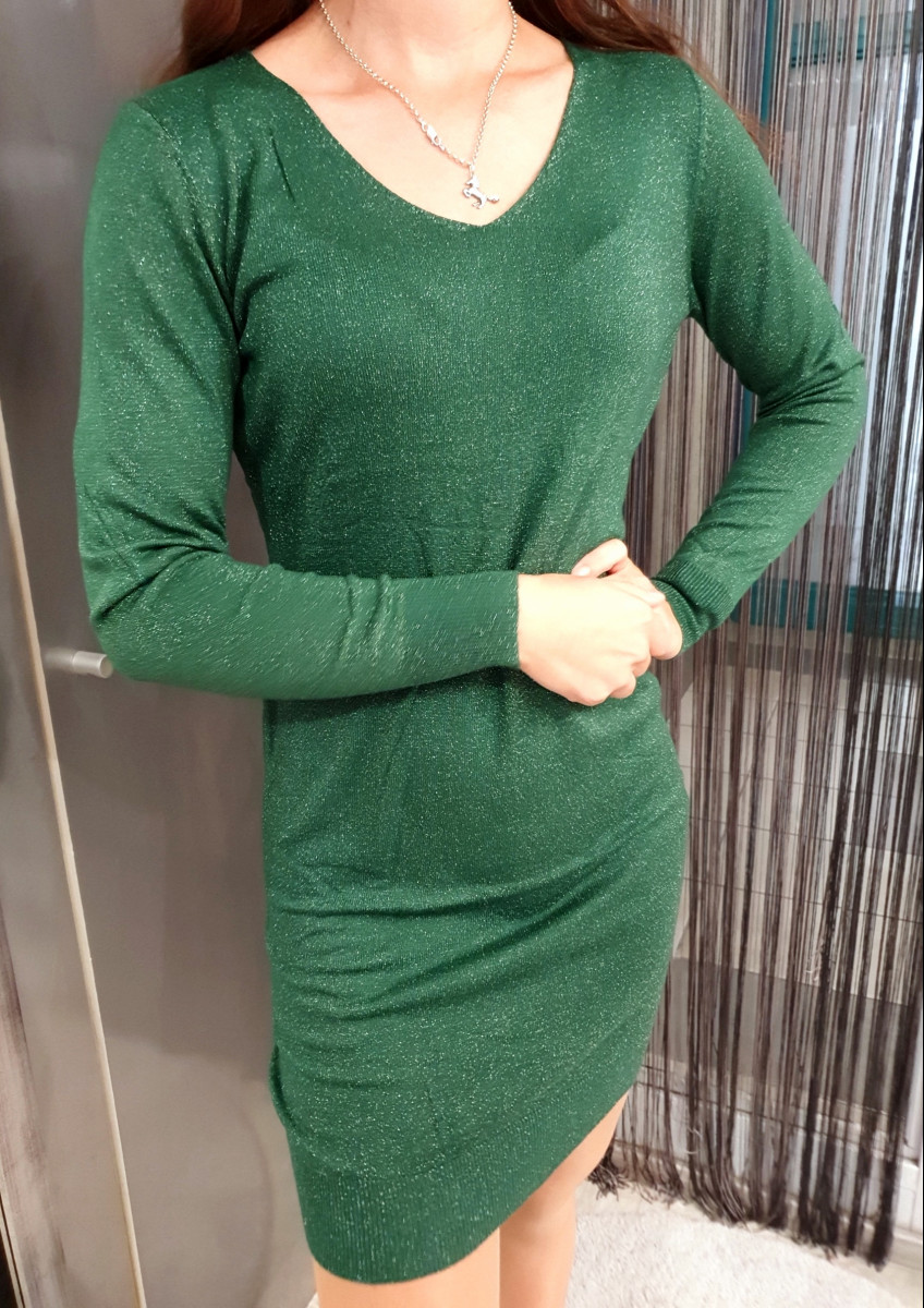 Puha rugalmas anyagú szolidan csillogó alakot követő finomkötött ruha.