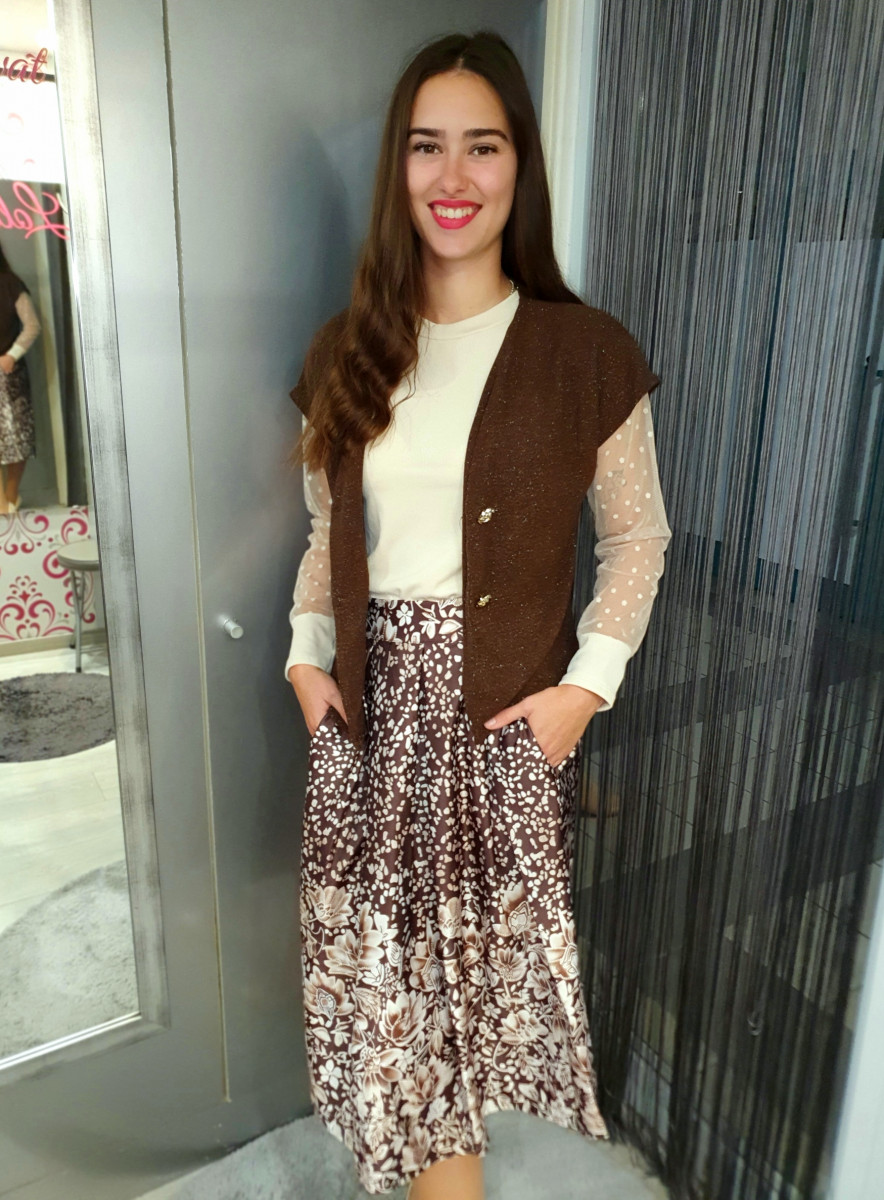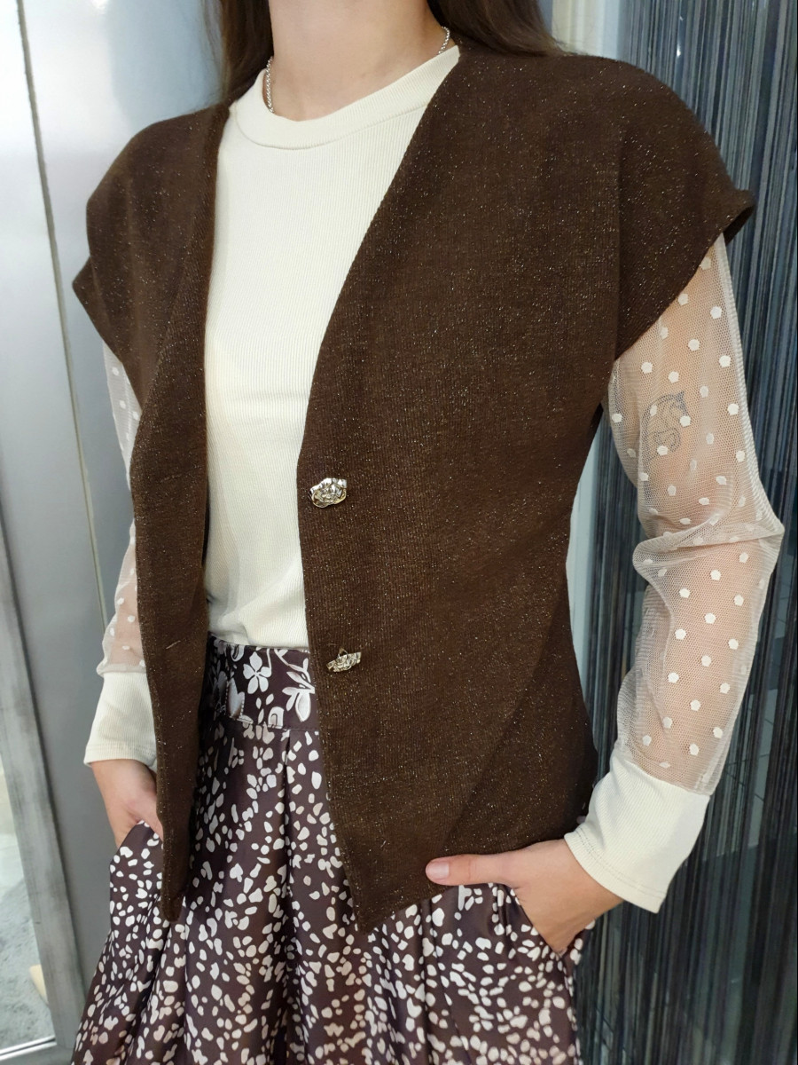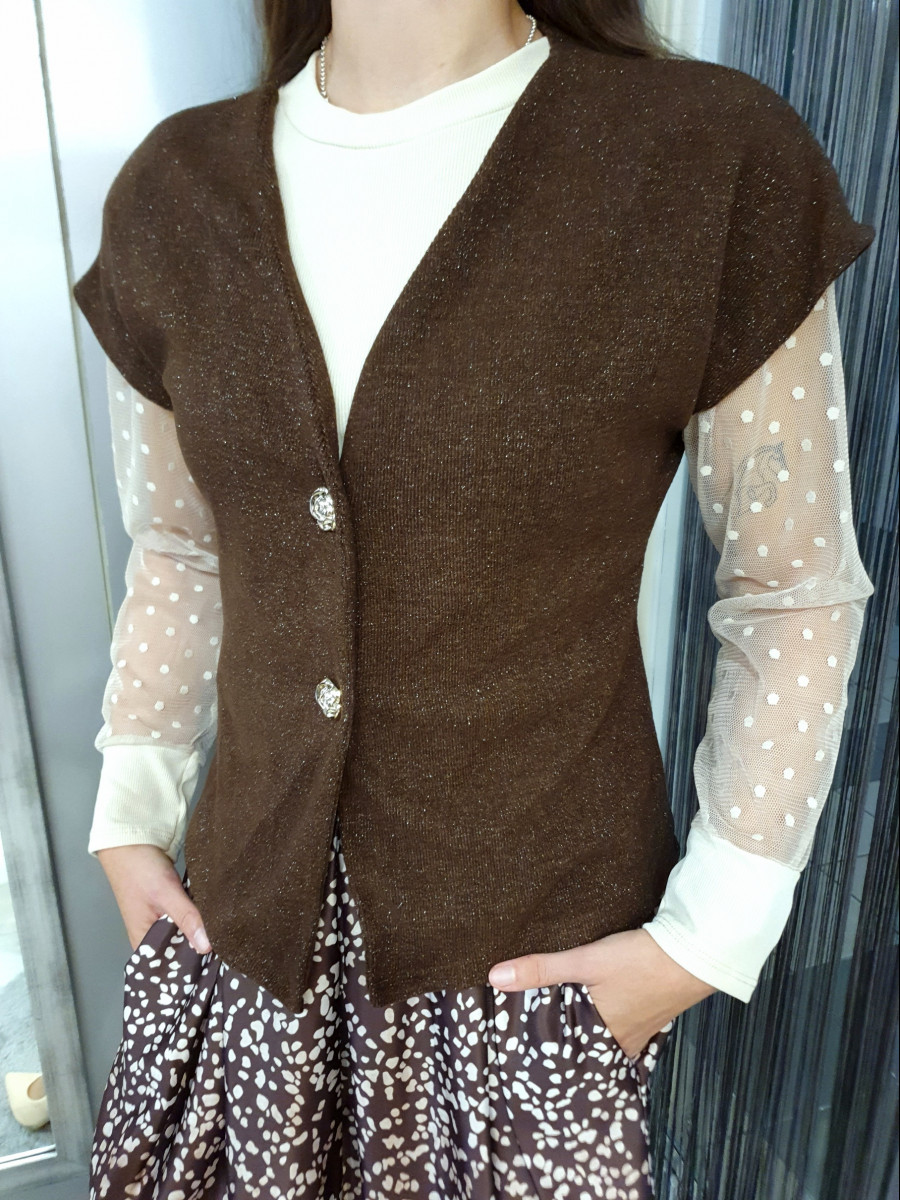 Puha rugalmas anyagú finomkötött szolidan csillogós elöl gombos mellényke.