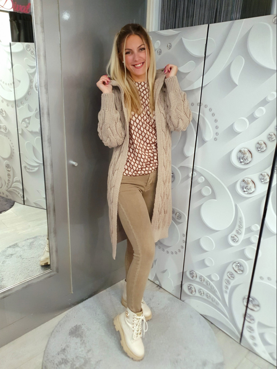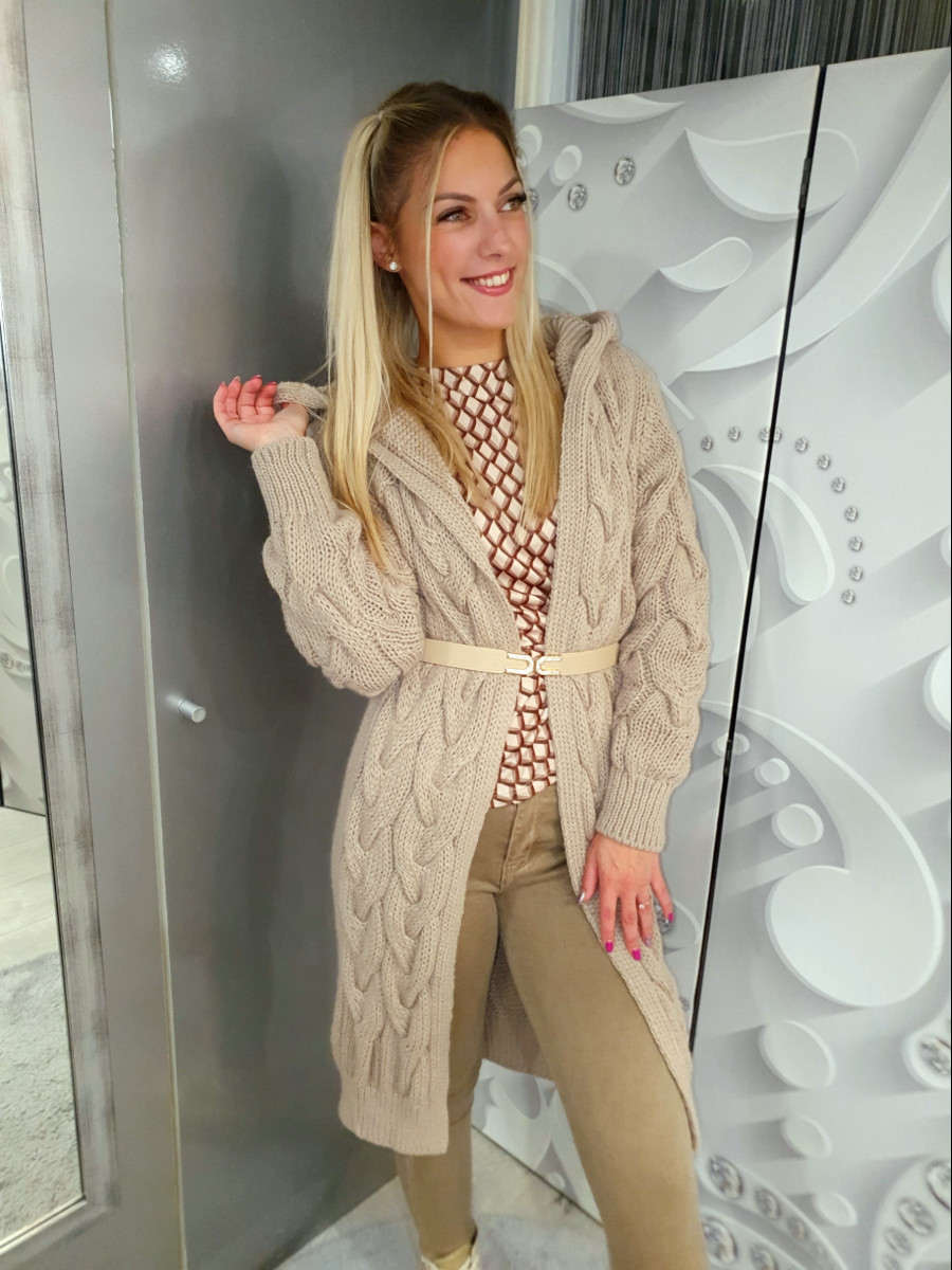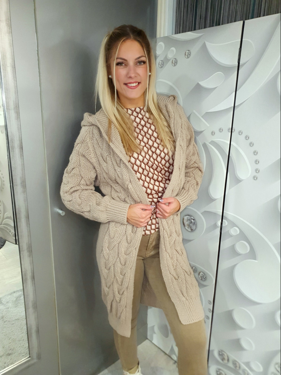 Vastag meleg anyagú hosszított fazonú kapucnis kötött kardigán.