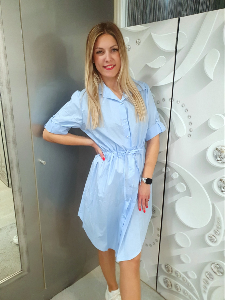 Kényelmes anyagú elöl gombos fazonú derekán karcsúsítható , összehúzható rövid ujjú csini ingruha.
