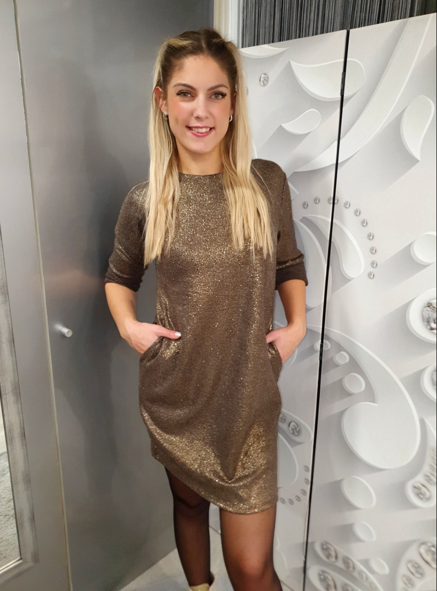 Kényelmes, lazább fazonú melegebb anyagú csinos oldalán zsebes barna - fényes, csillogó arany színű ruha.