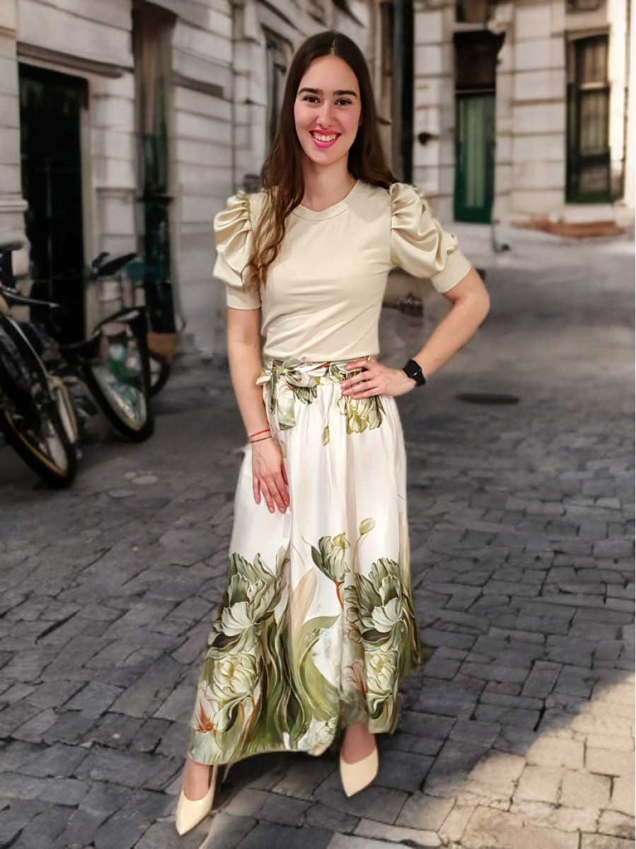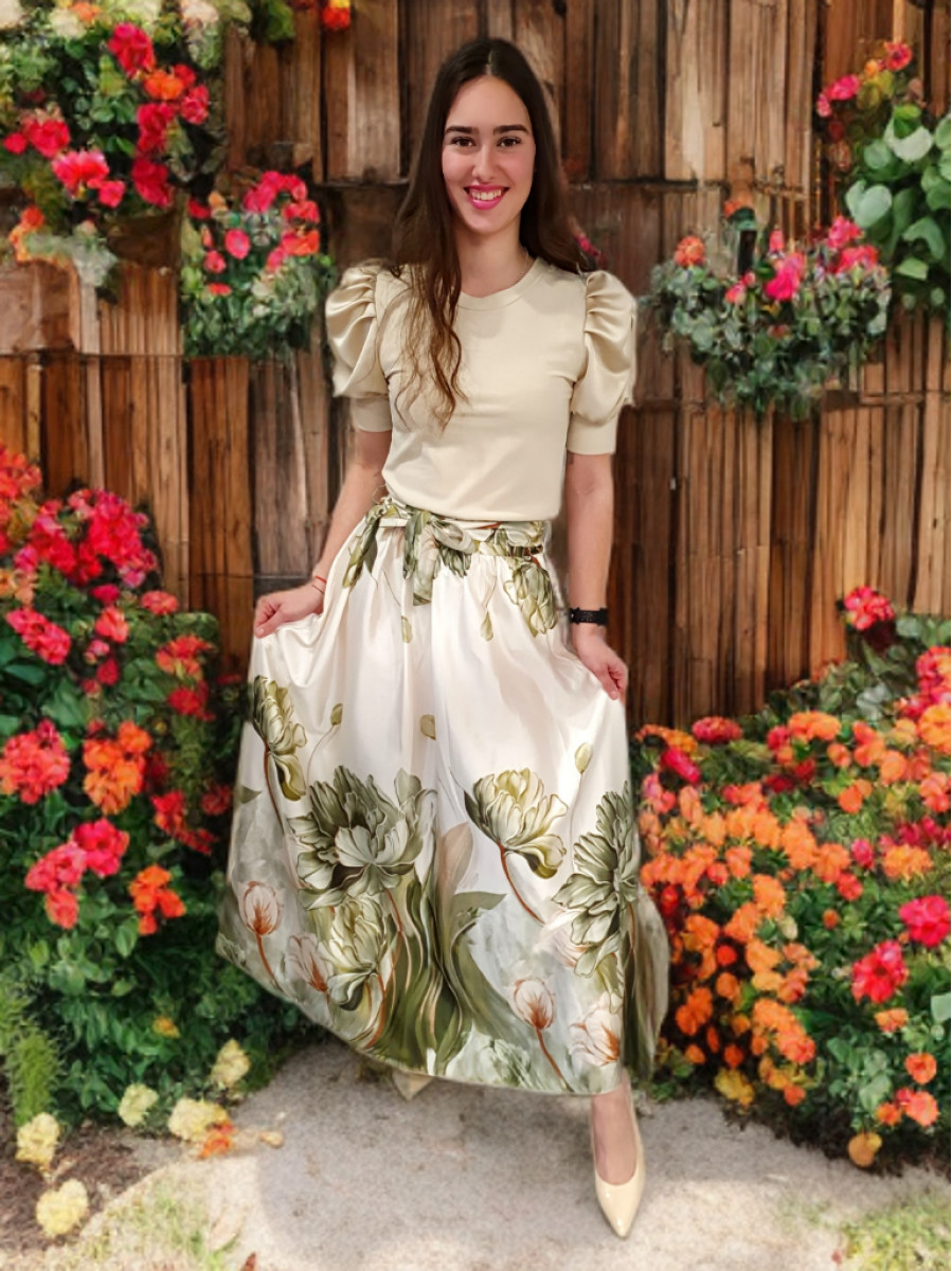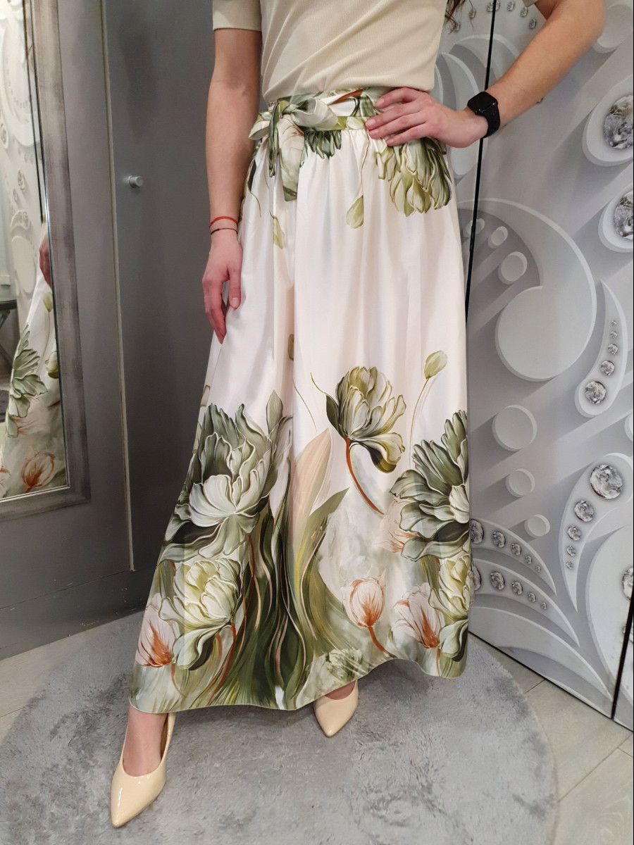 Kényelmes gumis derekú gyönyörű virágmintás maxi szatén alj.