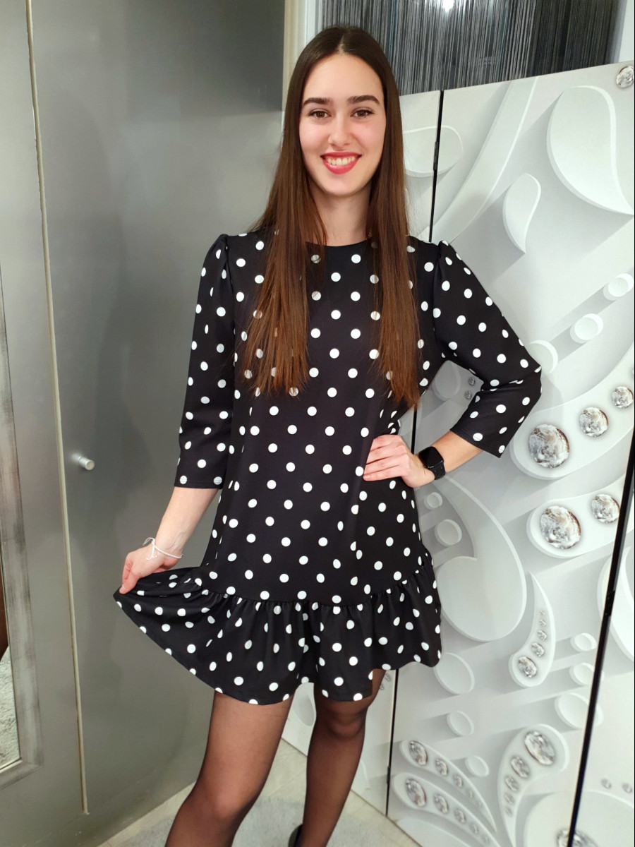 Kényelmes A vonalú háromnegyedes ujjú fodros aljú , pöttyös ruha.