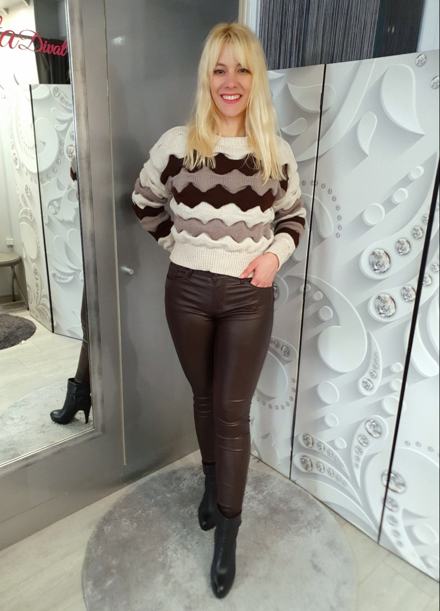 Kényelmes rugalmas anyagú csokibarna ökológiai bőr nadrág.