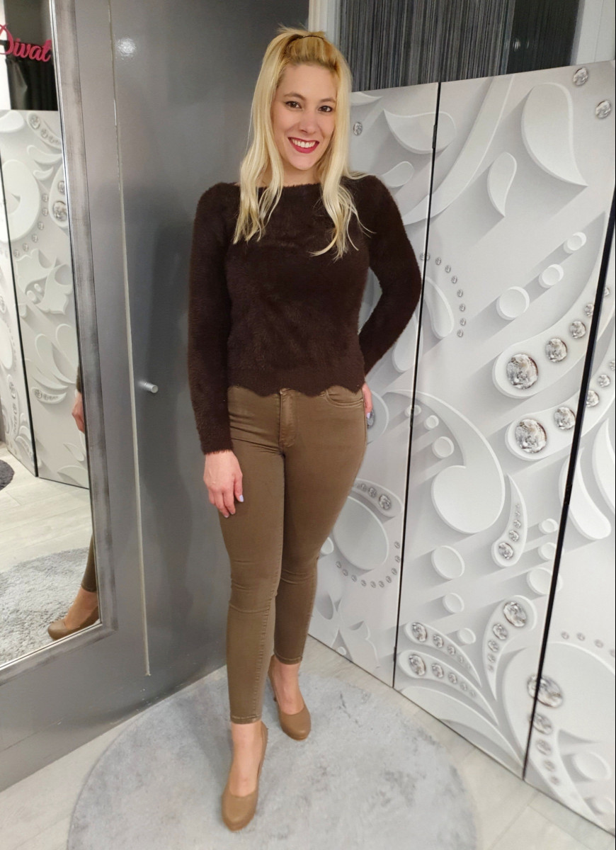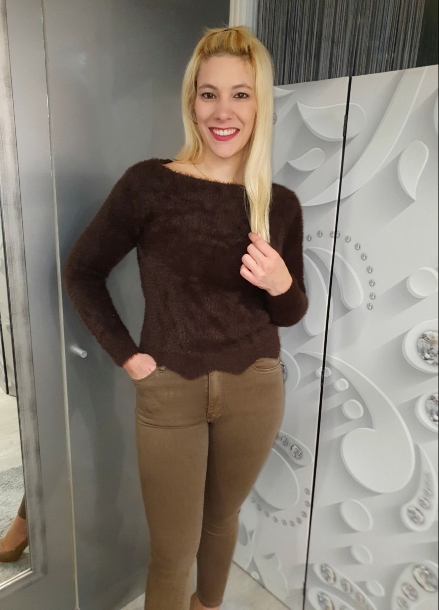 Pihe-puha szőrös anyagú rövidebb állású , hullámos aljú pulcsi.