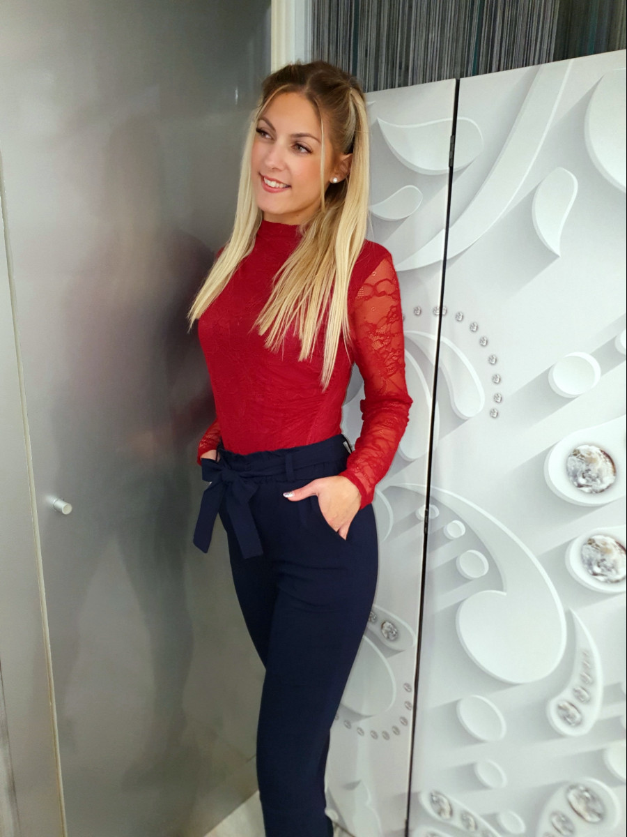 Csinos rugalmas anyagú dupla rétegű csipke felső.