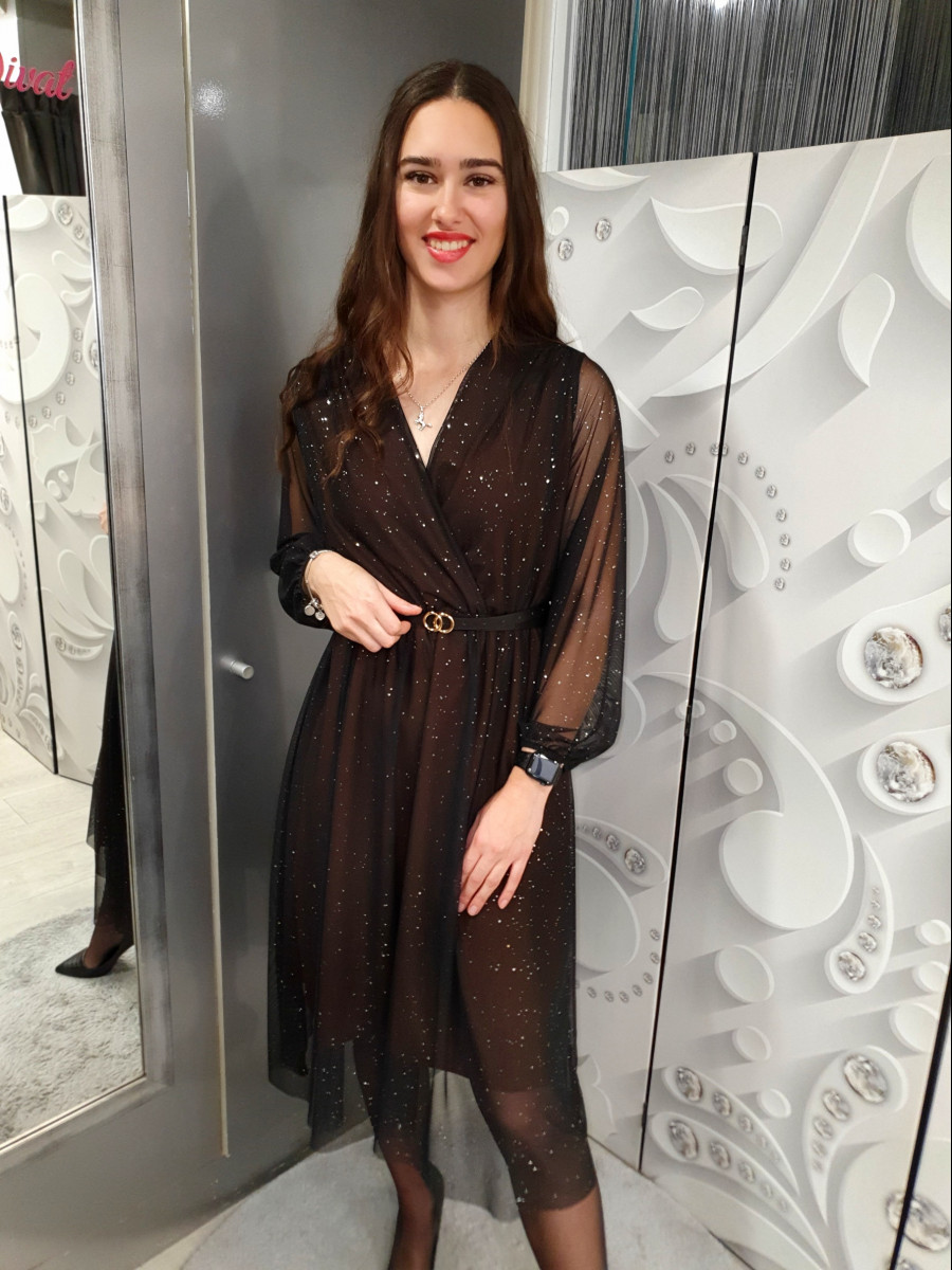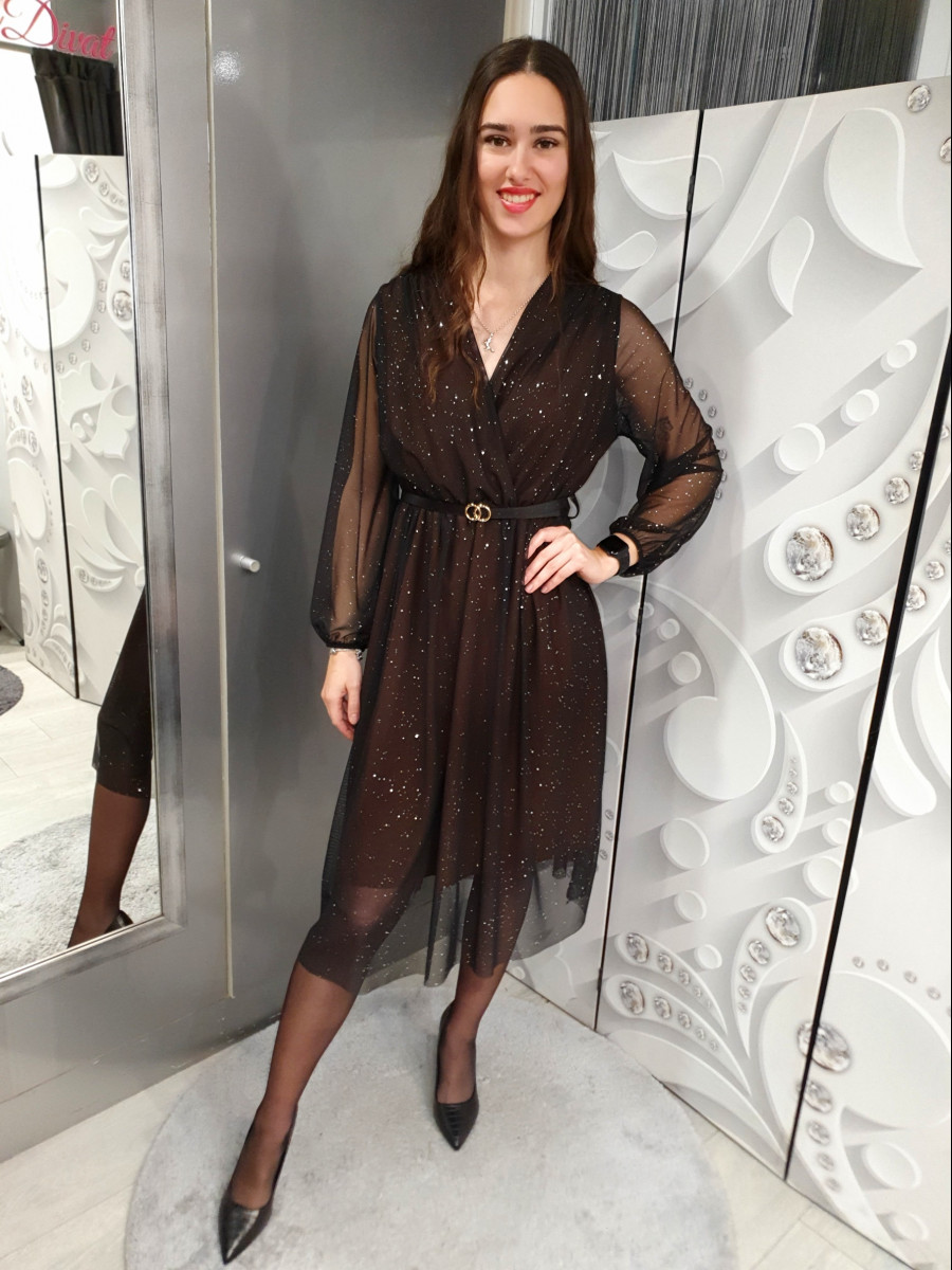 Kényelmes dupla rétegű barna betétes csillogó fekete muszlin anyagú ruha derekán övvel.