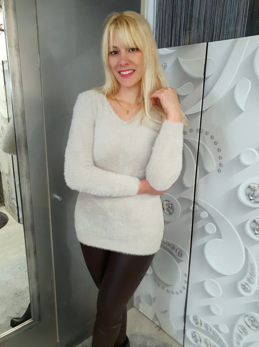 Pihe puha szőrös anyagú rugalmas nagyon kényelmes , meleg, hosszított pulóver.