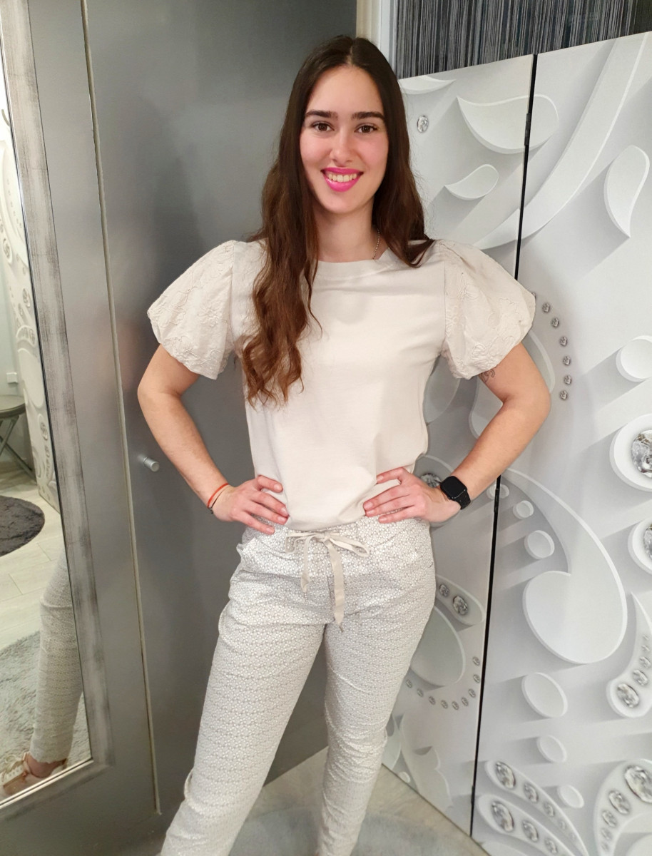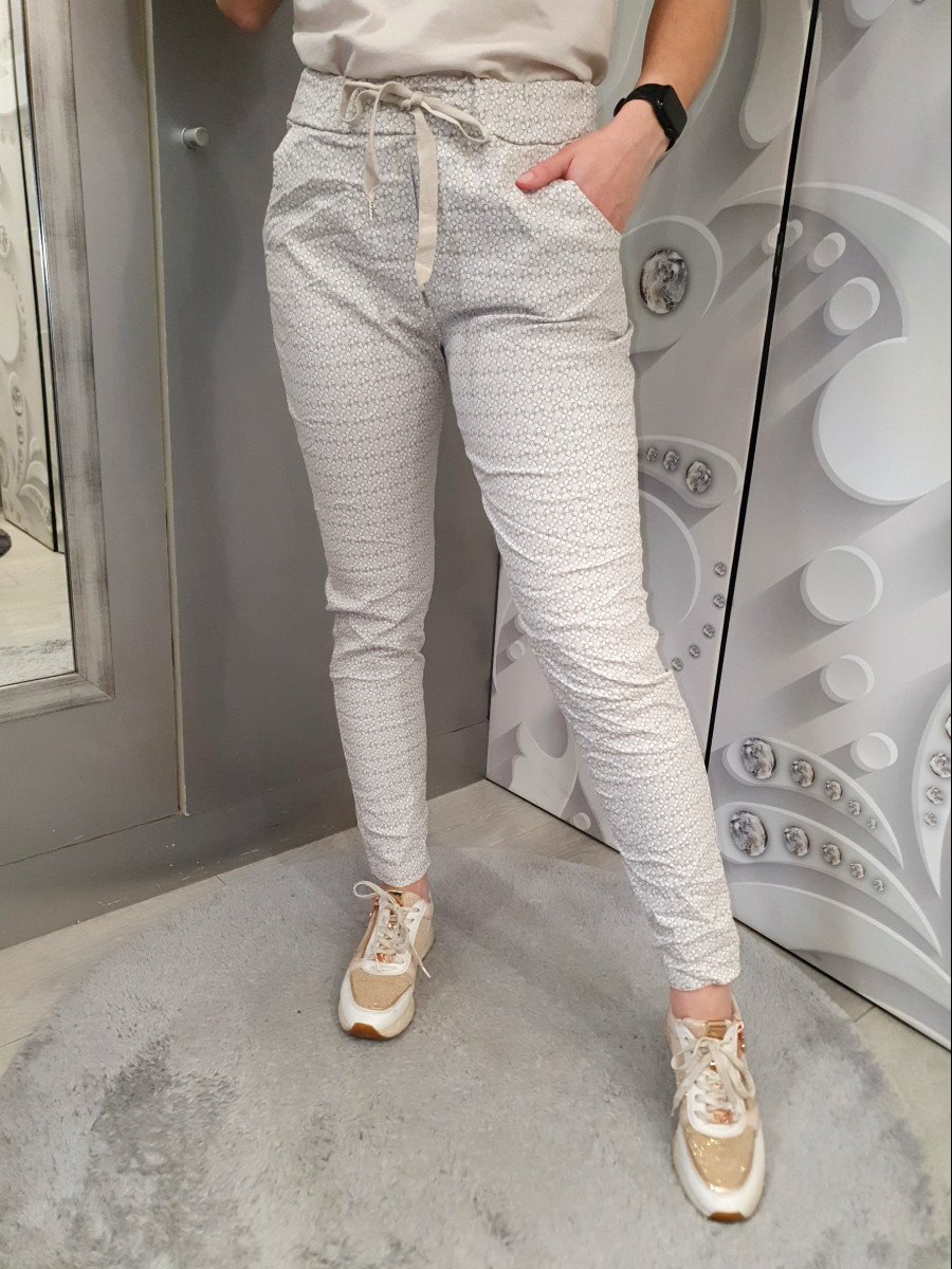 Nagyon kényelmes gumis anyagú, gumis derekú , bézs színű kis virág mintás nadrág.