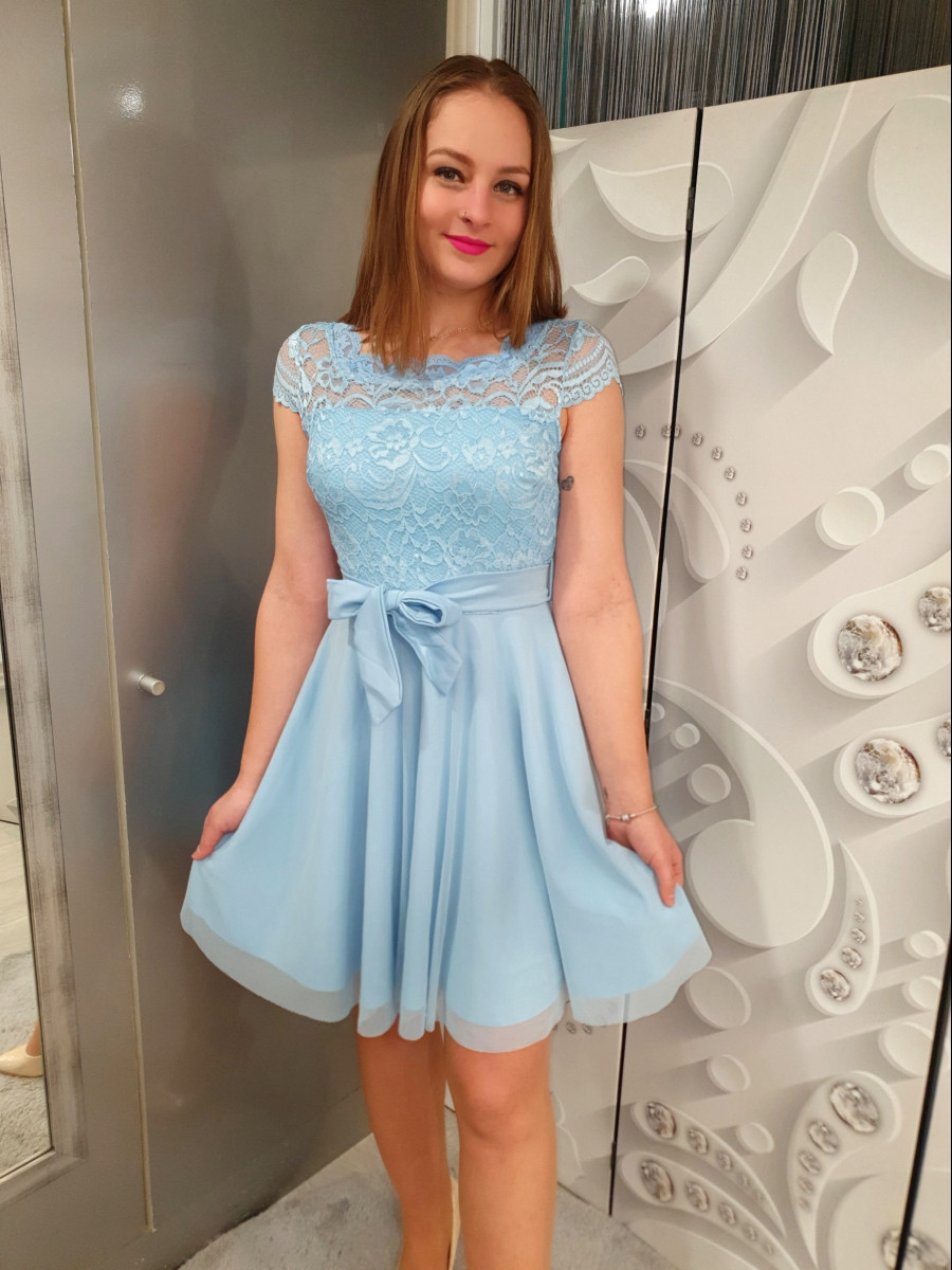Csinos csipkés szivacsos betétes, tüll szoknyás alkalmi egészruha, derekán kötővel, hátán cipzárral.